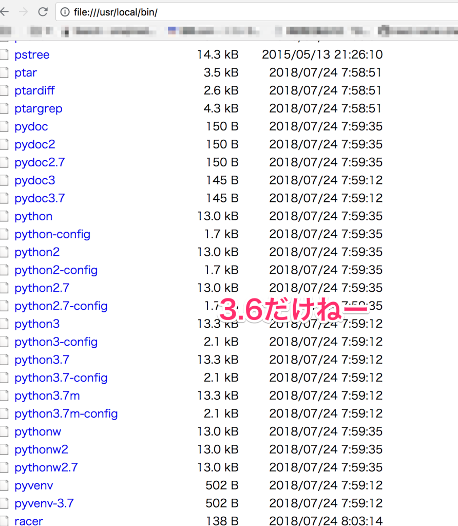 【Django】python manage.py runserverやったら「no such file or directory: /usr/local/bin/python3.6」 ブラウザ上でcmd + t そこに /usr/local/bin/ を入れてみてどうですか python3.6 ありますか?? おい 3.6だけねー なければ 入れないとダメですし...