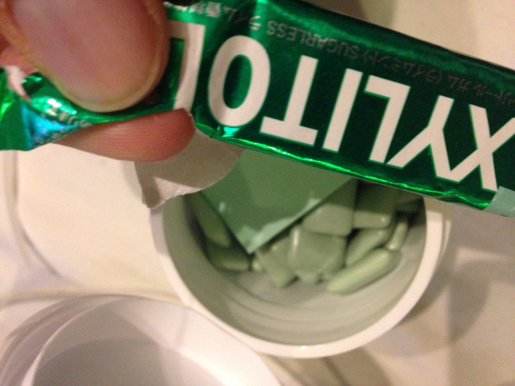 急場しのぎ的に購入したキシリトールガム。1粒1粒の包装紙を取ってボトルの方に1つ1つ移しているとき 「俺何してるんだろう」と思いましたよ。 -